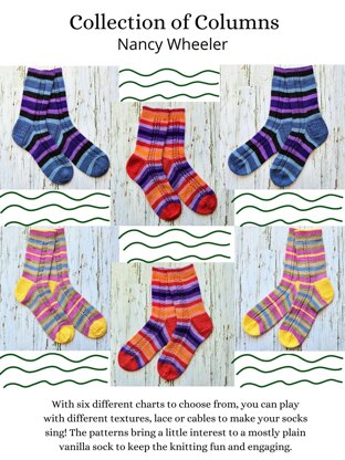 When you just need something for your self-striping or busy yarn, these 8 stitch charts are perfect! They add a little interest to a mainly vanilla sock. You can combine charts to build your own pattern. There are blank charts on the last page of the pattern to play and make your sock completely yours.