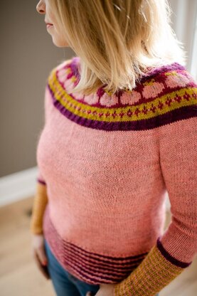Joyfully bright, color brings the happy. Sections of texture add even more fun. This yoked pullover is worked seamlessly from the top down with options for short or long sleeves, cropped or standard length & two waist shaping styles (or skip it!). Neckline is shaped with short rows and optional tubular hems (instructions provided) are accented with a rad, striped rib.