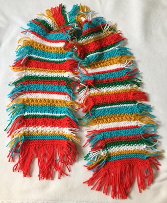 Now here is a great colorful scarf to wear during the Holiday season! All the young folks will definitely want one. You can use other colors if you wish, in this easy to knit textured stitch pattern scarf! This style also has fringe's all the way around for "cuteness" and for extra warmth! Everyone will want one, especially the ones that spend a lot of time outdoors. Use your own imagination in color schemes, like shades of blue, would be beautiful in this! Good thing about this scarf, it will help you use up all those scrap yarns and leftover yarns you have been saving through the year!