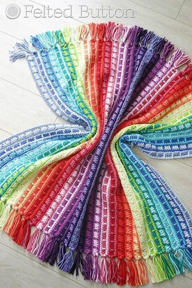 The detailed 6 page pattern includes: ~complete materials list including quantity/brand/amount of yarn used in sample ~several photos to assist with attaching the tassels (optional) ~complete written instructions in standard US crochet terms including special stitches, stitch abbreviations, and notes sections ~color table detailing color changes