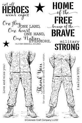 Designer clear stamps created with you in mind! These stamps are thoughtful, serious and often times funny! This package contains Military Strong-Lovely Legs: a set of 12 clear stamps on one 4x6 inch backing sheet. Made in USA.