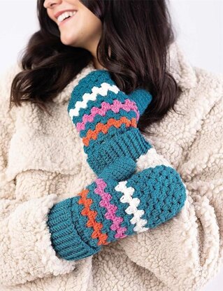 The mittens use DK merino yarn with a tension (gauge) of 5 groups to 10cm/4in. The pattern is available in both UK and US crochet terms. It is intermediate level and comes in 3 sizes. They are worked in the round starting from the rib. See photos for yarn quantities and sizing.