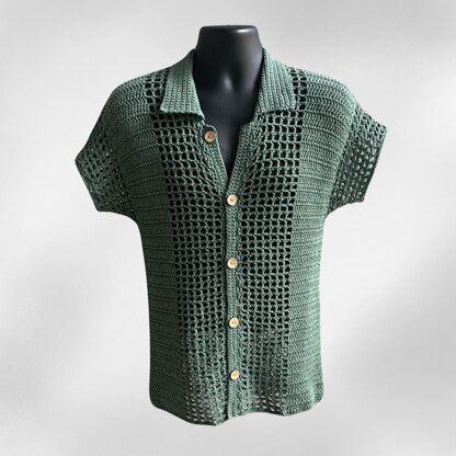 A unisex crochet button-up shirt pattern designed for both men and women. This lightweight mesh collared shirt is suitable for warm weather and includes 8 sizes from S to 5XL, with finished chest measurements from 36” to 64” (91–162 cm). The shirt is worked seamlessly from the bottom up to the armholes, with no side seams to sew, and allows easy adjustment to length and sleeves.
