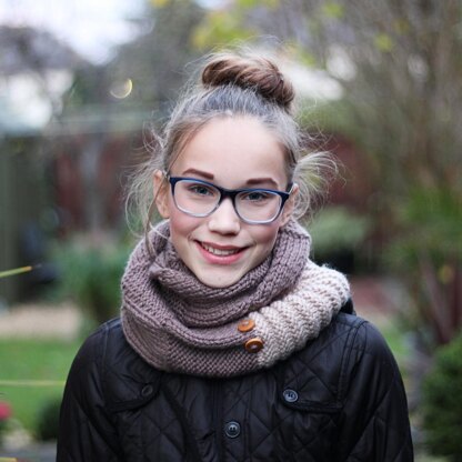 Comfort infinity scarf is composed of a textured patterns in 2 shades with added buttons for appeal.