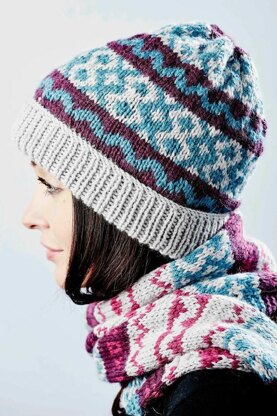 This is a great unisex hat knitted in a Fair Isle pattern. It has a ribbed band and fits snuggly over the ears to keep you warm on a chilly day. It is knitted in a standard guage Aran yarn. The hat is one of 6 items I designed for Roosters Yarns and will complement the scarf, snood and wrist cuffs.