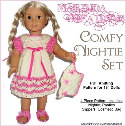 Another of my own designs to fit American Girl Doll , South African Girl Doll , Harmony Club Doll , Gotz Dolls and other 18'' Dolls with similar measurements . The set includes a nightie , panties , cute slippers and toiletry / make up bag ready for a Sleep over .