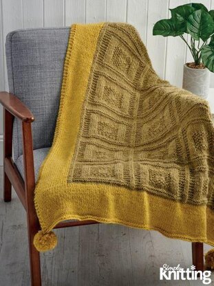 This is a pattern for a Concentric squares Throw, orignally published in Smply Knitting. It is in a knit and purl stitch with stocking stitch and garter stitch edges, and pompoms at the corners. Photo Simply Knitting.