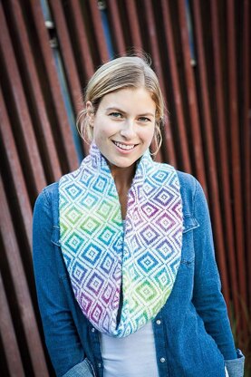 The Concentrical Cowl is knit in the round width-wise, starting from a provisional cast on, which is Kitchenered to the opposite end to form a double thick loop. Two colors are worked in a stranding motif throughout.
