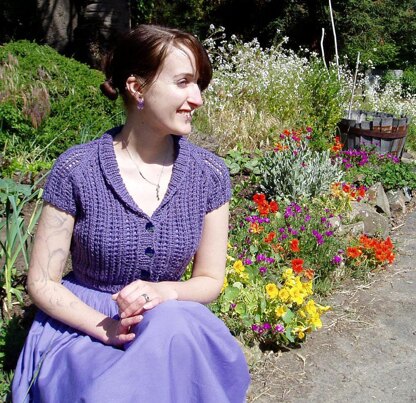 This cropped lace cardigan is the ideal layer to wear with summer dresses. It provides just enough coverage, while the openwork pattern keeps it from getting too warm – perfect for summer evenings. The truncated length and small shawl collar are reminiscent of ultra feminine 1950s style. Knit seamlessly from the hem up, this sweater is quick and fun to knit.