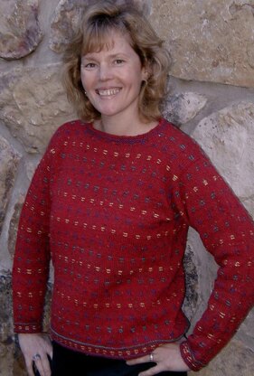 Confetti is knitted in worsted weight yarn, and the brand is not specified. This pattern is written for seamless construction: circular up to the armholes, with sleeves picked up and knitted down to the cuffs. You can use one contrast color or many. The yardage stated for the Contrast Color is the total necessary. Three contrast colors were used in the garment shown.