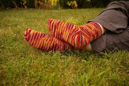 In thinking about the name of the colorway for this yarn—Eruption—I kept having visions of lava flows. These visions became the simple broken rib motif that comes together on the back of the leg and the top of the foot. An easy knit, the pattern instead may push you to try—or come back to—a new-to-you heel and toe technique.