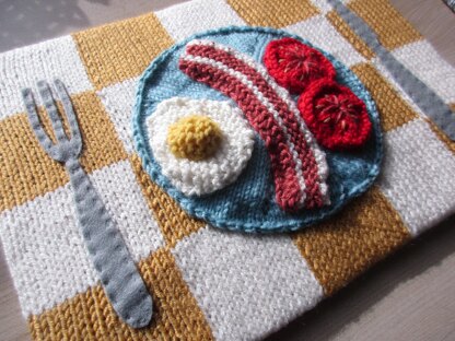 This is a pattern for cooked breakfast wall art, a fun project and a good way to use up small amounts of yarn. The base is knitted in intarsia, and the plate as a circle with increases worked flat. The egg is in garter stitch shaped, and the tomatoes are circles with embroidery. The bacon is in garter stitch striped. The knife and fork are cut out from felt using a template. All of the motifs are easy to make.