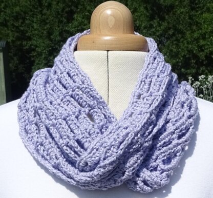 I am always looking for cool cowls to wear in warm weather. This cowl has a light open stitch pattern which keeps it cool.  It uses just one 100g ball of Aran. You can make it in a couple of evenings, so is perfect for that last minute gift (if you can part with it).