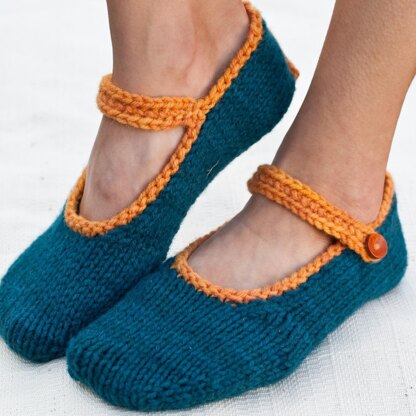 These simple slippers knit up very quickly in bulky yarn, and are worked in one piece from the toe to the heel. The contrasting strap and trim gives a sporty look to the ballet-style slippers. The pattern is written for four adult sizes and is easily adjustable for the perfect fit.