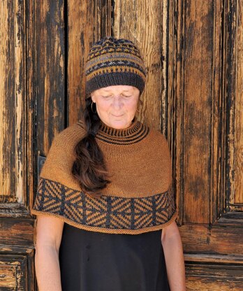 Copper Queen, a short poncho/capelet is knitted in the round from the top down using the stranded color-work technique. The large color-work section is both written line by line and charted for your knitting preference. A strand of Aerial, a lace weight silk and mohair blend is held together with a strand of Ultra Alpaca for a subtle halo and additional warmth in the solid color section.