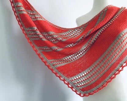 In this shawl both colours are used in the selvage stitches that were specifically invented for the two-colour shawls offered in the Island Knit Design pattern store. The garter stitch pattern sections alternate with the contrast colour eyelet rows sections for added visual interest and to keep the knitting fun. This shawl, of course, can be easily turned into a single colour project simplifying the task, if a knitter prefer.