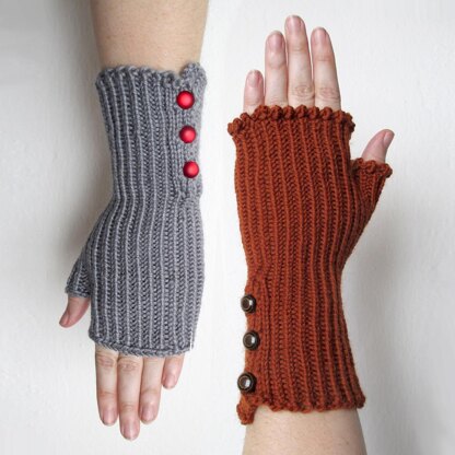 These simple fingerless gloves use a twisted rib pattern to create a corduroy-like texture when worn. Choose from a simple flat edge or a fancy 2-stitch picot edge to finish your fingerless gloves, directions for both included.