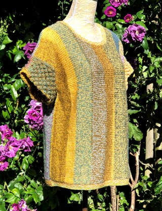 A perfect slouchy, boyfriend style thrown on top. Just 2 pieces form the main part of this intriguing, sideways knitted design. It looks striking in this gorgeous multi-coloured yarn and because it is worked sideways the vertical striped effect is very flattering. It's worked mainly in stocking stitch with deep bramble stitch sleeve borders incorporated into the back and front. Narrow garter stitch edgings complete the design. Please note: the second size used exactly 2 balls, so it is important your tension is correct. If you do find you are slightly short, you could reduce the lower edge borders by 2 rows, or use an odd bit of toning plain chunky to do both neck and lower borders.