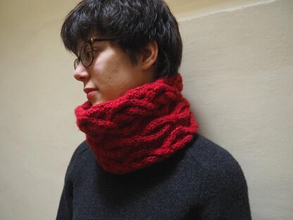 This cowl is knitted in the round, from side to side, with a provisional cast-on then grafted to the last stitches to join it in a round. It features different kind of cable over knits and purls, creating an oriental pattern.
