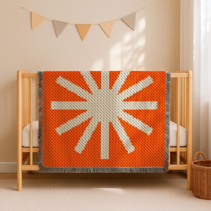 Made using the C2C crochet technique, striking pixel design features a starburst radiating from a vivid orange background - perfect for retro throw, eye-catching nursery decor, or modern afghan.