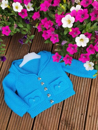 Cornflower jacket is made for 12 months baby. It's design is unisex and is suitable for both girls and boys (without bows). I made it blue but it will look pretty in any other colour of your preference.