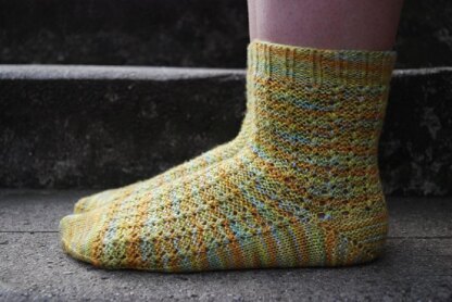 A fun, easy going sock. The perfect travel knitting companion. Subtle texture and eyelets flow down the leg and onto the foot while squishy garter stitch envelopes the heel. These top down socks are a soothing knit and a great project for the adventurous beginner.