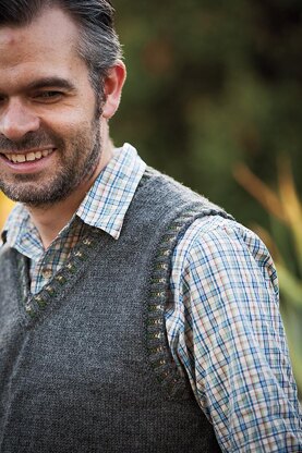 This classic vest is worked at for the front and back. After blocking the two pieces, the vest is sewn together and then the neck is picked up and worked flat. The arm bands are picked up and worked in the round. The ribbing is worked with a stranding technique.