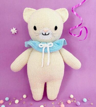 All doll pieces are knitted in the round on circular needles. The legs, body, and head are knit as one continuous piece. The arms, ears, tail, and ruffle are knitted in the round separately and then added to the body/head. A crochet hook is used for provisional cast-ons and for making the bow.