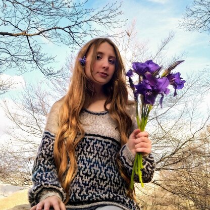 Cosmic calligraphy is a drop shoulder pullover featuring a fun mosaic stitch on the body and the sleeves that makes me think of a secret, mysterious or even alien alphabet. . This pullover has a boxy line and two options for the sleeves: bell or balloon. It is worked seamlessly from the top down with drop sleeves, starting from the shoulders and growing down to form the rest of the body. The lower body and the sleeves are worked in a simple but complex-looking mosaic colorwork that, together with the degradé yarn creates a fascinating arabesque effect.
