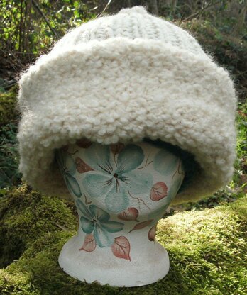 This ribbed hat in bulky yarn with a folded up cuff in boucle reminds me of something Lara might have worn in Dr. Zhivago. The boucle cuff is worked in stockinette stitch from the wrong side, then folded up when worn. The body of the hat is worked in either bulky weight yarn or worsted weight used doubled. Because of the bulk of the yarn, the hat is somewhat oversized.