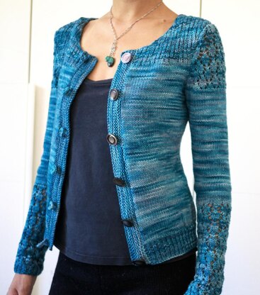 Costanza is a cardigan with the fit of a tailored jacket. The structure is provided by the seams and the unique shape of the shoulders and the armholes. The simple stitch pattern compliments the subtle color change of a semi-solid yarn. The buttonloop closures complete the tailored look. This cardigan is worked from the bottom-up in pieces, which makes it a great on-the-go knitting project.