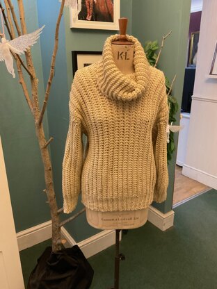Cosy is a sidewise crochet over size jumper. The easy 2 row stitch pattern in super stretchy, so it easily fits chest sizes up to 50 inches!
