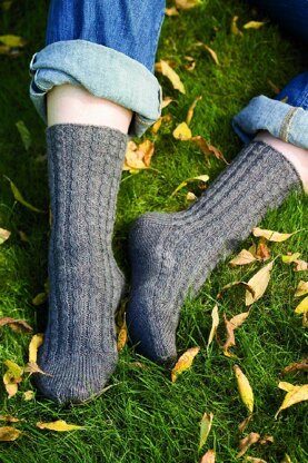 Comfy socks for him or her for everyday walking or curling up in front of a fire. The simple cable pattern extends down the top of the foot making the sock slightly 'hug' the wearer.