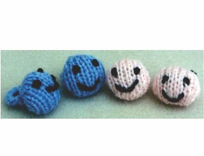 These cotton ball size smiley faces, have a loop so you can thread on to babies and children's shoe laces! These look back at the child with a smile from their shoes! Make these up in many different colors, and for gifts! Use up scraps of sport weight yarns, knitting needles US # 2. These knit up fast, so you can make sets of 4 or 8 for gifts!