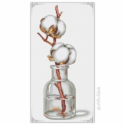 Blooming Cotton Flower Counted Cross Stitch. Easy to Follow Embroidery Chart featuring a delicate cotton flower in a glass jar. Make your own very symbolic handmade gift - this odd yet stunning flower means to cherish the people around, a promise of wealth and well being in your life.\n\nSize: 67w x 141h stitches\nStitched on Aida 14ct: approx 12 x 26 cm (5 x 10 in)\nDMC Threads: 17 solid colours (4 blends)\nUsed stitches: full cross stitch, half cross-stitch, backstitch\nSkill level: Easy / Beginner\nStitch time: 25-37h\n\nCross stitch pattern in PDF, Instant Digital Download includes: 1) cover page with preview; 2) instructions, symbols key and shopping list (DMC thread colour numbers and estimates, as well as fabric options); 3) two black and white charts, with and without backstitch; 4) two colour charts, with and without backstitch; 5) single page PDF for Pattern Keeper (available on request).\n\nPlease note: This pattern is for personal use only - not for commercial use. You can't make copies of our charts to distribute (either as PDF or printed versions) but you can definitely sell your finished cross stitch work.