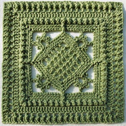 Counterpoint is the re-working of the very first block I ever designed. It was inspired by several vintage patterns and worked in DK yarn, this new 12 inch version is intended for use with worsted weight yarn. Those of you who are familiar with my work will recognize the “special stitches”. What you may not know is that the ring of picots in this pattern gave me the idea for the loop version of the crocodile stitch. This pattern uses American terminology throughout.
