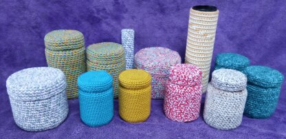 This is a method to cover any size of straight-sided jar or pot with a lid that screws on or similar (I have some with a sort of ‘bung’ lid). You work the base first, to fit the size, then go up the side, then decrease to keep it in place (IF the jar/pot has a ‘shoulder’), and do the same the other way up to make the cover for the lid. It’s really easy, and the results make good storage pots and nice little gifts, especially if you have small items to go inside such as jewellery or beauty products, or small toys such as marbles or game pieces – even cookies. Most yarns, including the cottons I like to use for this, will stretch enough that the covers can be put on and taken off as often as you like if they or the jars need washing! I also suggest how to work out how much yarn you’ll need, but you do have to do at least part of the work for size, first. There's a simple version for a mustard jar at the end, to make it really clear what to do.