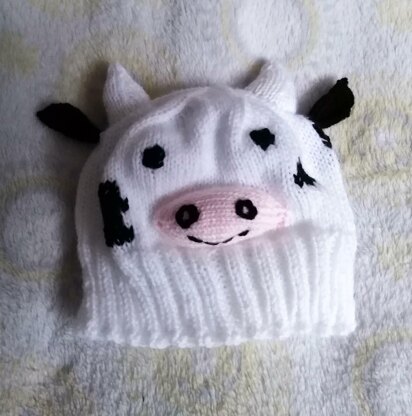 The hat is knitted in the round on 4mm needles using DK yarn. The horns, ears and snout are knitted separately and sewn on and then features are embroidered. Finally black patches are swiss darned randomly. I chose swiss darning so it wouldn't affect the stretchiness of the hat.