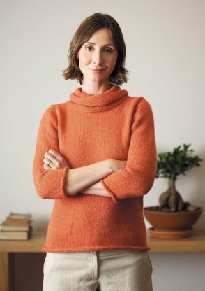 Worked in Stocking stitch and featuring ¾ sleeves and soft folding ‘cowl’ collar. The darts knitted into the bodice enhance the shaping and although these may appear challenging to a beginner knitter, they are easy to achieve.