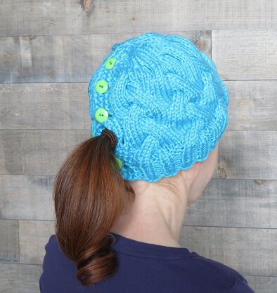 What could be cozier than a soft cabled hat? This one gives you a lot of cable for not much trouble - only six rows involve cabling; the rest is just knit and purl. And no reason to squash your ponytail under your hat - a button band lets you wear your ponytail high, low, or in between, however you like. It’s worked right along with the hat, so no need to pick up stitches or do any seaming. Fun!