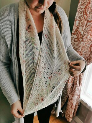 A simple cowl knit flat and then seamed together in the end. A very delicate striping effect is established by alternating mohair and fingering weight yarn. A large lace section has been added to break up the mindless knitting and to add some interest. The lace pattern resembles snowflakes and adds character to this otherwise dreamy looking fabric. The cowl is flanked by an i-cord edging with yarn overs and a center decrease to give it some shape.