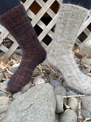 This is a ribbed sock with a German Short Row Heel. This type of short row heel adds a bit more depth than a typical short row heel, so if you have a higher instep, these socks may fit you better.