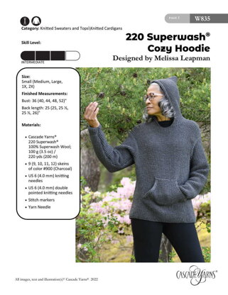 Cozy Hoodie in Cascade Yarns 220 Superwash - W835 - Downloadable PDF is a free Intermediate Knitting pattern by Melissa Leapman, available as a Downloadable PDF and includes instructions in English. Super fun to make, this pattern could be your next masterpiece!