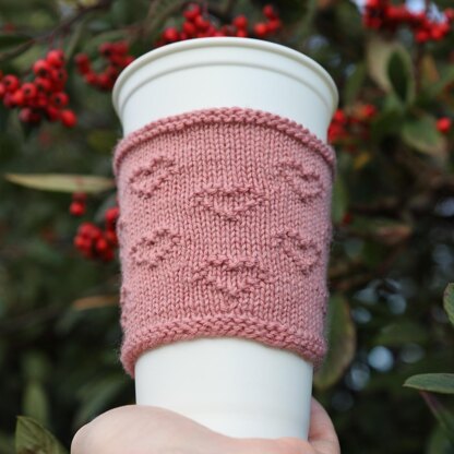 The pattern includes written instruction and chart (it is not necessary to read charts) for knitting in the round cup cozy with sixteen small hearts.