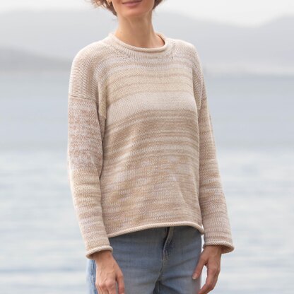 This easy bottom-up sweater is worked flat in pieces and then seamed. The rolled neckline adds a casual touch, and you can use either a single strand of Worsted or two strands of Sport yarn held together to customize the weight and feel of your pullover. Skill level: Easy