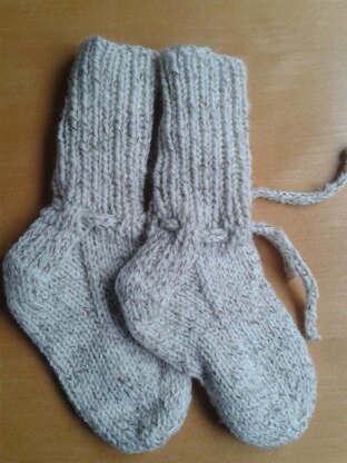 These socks come in 5 sizes from baby to adult L. They're knit from the cuff down with a slipped stitch heel flap for extra wear and a wedge toe. The i-cord tie is designed to keep the socks on wriggly baby and toddler toes but are optional for all sizes.