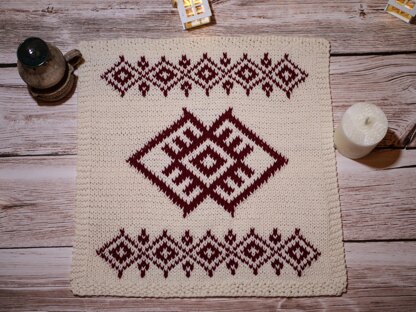 This fair isle placemat is easy to knit and would add ethnical touch to your interior. The design features Slavonic symbols which mean union of the sun and the earth, of the man and the woman, and bring welfare.