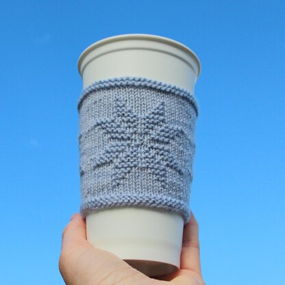 The pattern includes written instruction (stitch by stitch and row by row) and chart (it is not necessary to read charts) for knitting in the round cup cozy with three snowflakes.