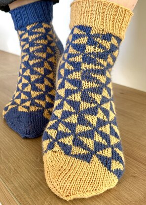 The former fishing village Nazaré north of Lisbon has become a famous hotspot for the best surfers in the world. From the district Sitio, 110 metres above the town centre, you have an incredible view of the Atlantic and the gigantic waves. Before Sitio became a tourist magnet, the pilgrimage church Nossa Senhora was the highlight for visitors. The square between the church and the viewpoint boast a nice pattern in the pavement that I replicated in these socks.
