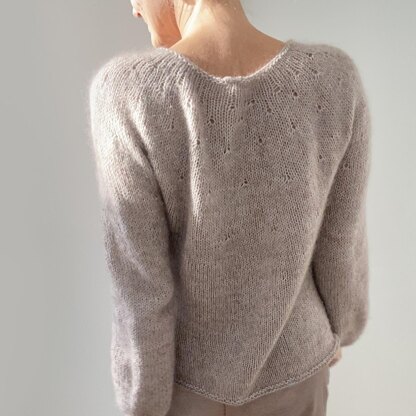 Knit seamlessly from the top down with almost only knit stitches… Little eyelets frame the neckline, and a combination of two yarns held together make this jumper a soft and fluffy little cloud. Choose from 3 options for the body shape to knit the perfectly fitting sweater and choose from 2 options for the sleeves.